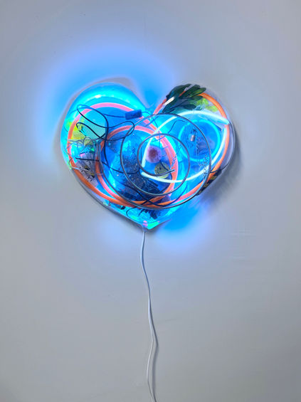 Resin, Glass & LED neon, wood, power hub, chain & lock, synthetic flowers, mixed media
