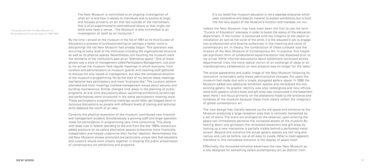 New Work: Art from the Workers at the New Museum, was an exhibition created by the workers at the New Museum and produced by Lena Imamura for The Stanton Chapter.